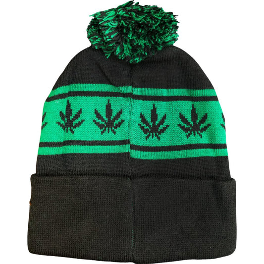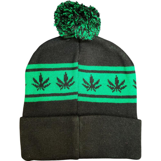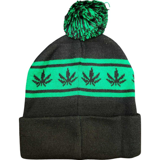블랙 Pom 커프 니트 마리화나 잎 프린트 스트라이프 비니 모자