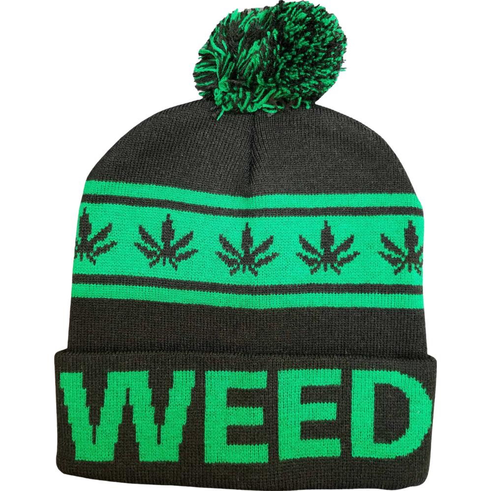 블랙 Pom 커프 니트 마리화나 & 위드 프린트 스트라이프 비니 모자
