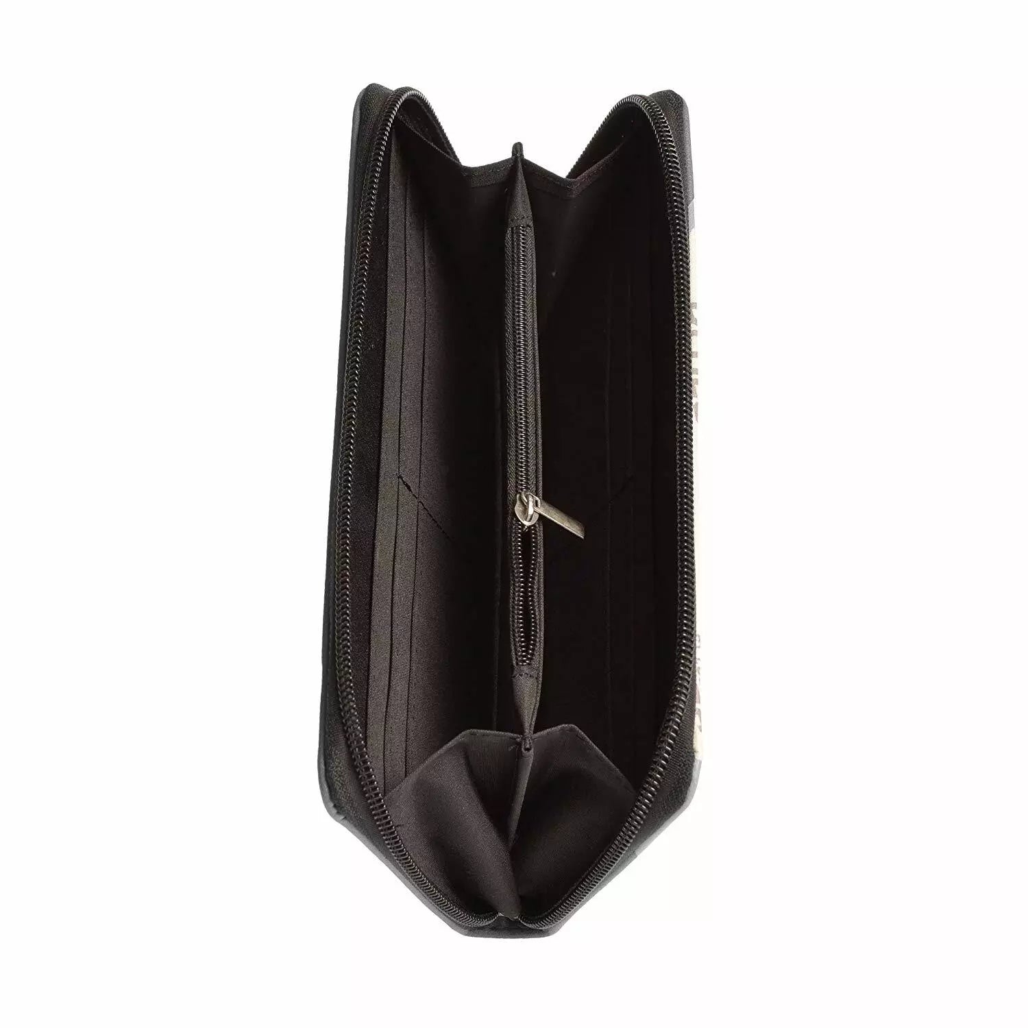 - Has two compartments, 8 credit card slots, and a zippered change pouch